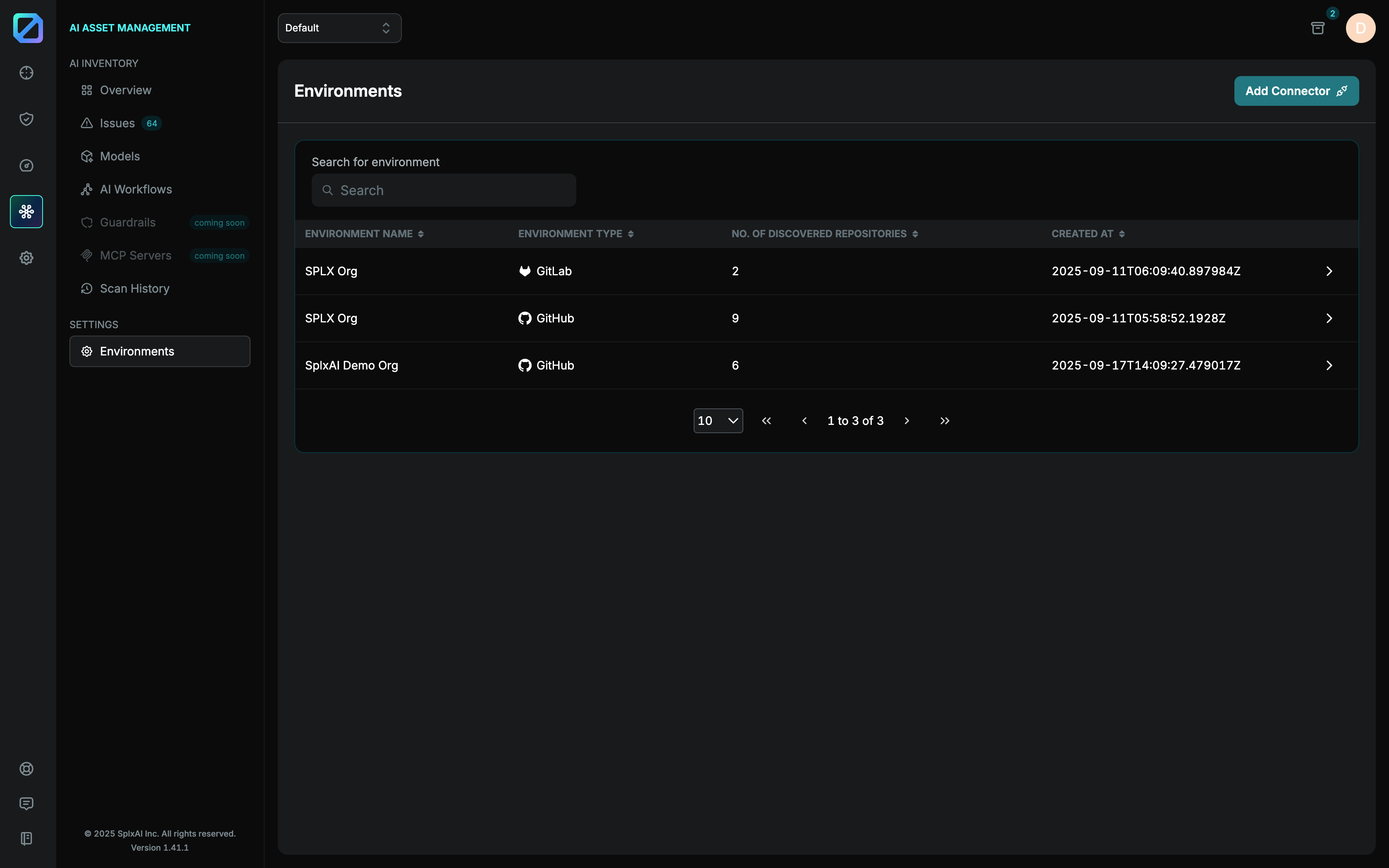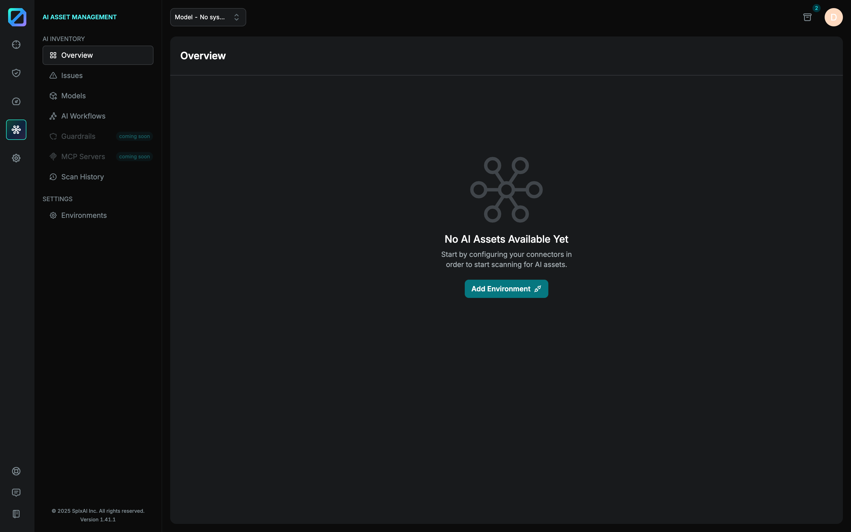 AI Assets requires a connected environment before it can begin discovery. Once connected, AI Assets will scan, discover, and populate your AI inventory with Models, AI Workflows, MCP Servers, Guardrails, and custom tools found in your infrastructure.