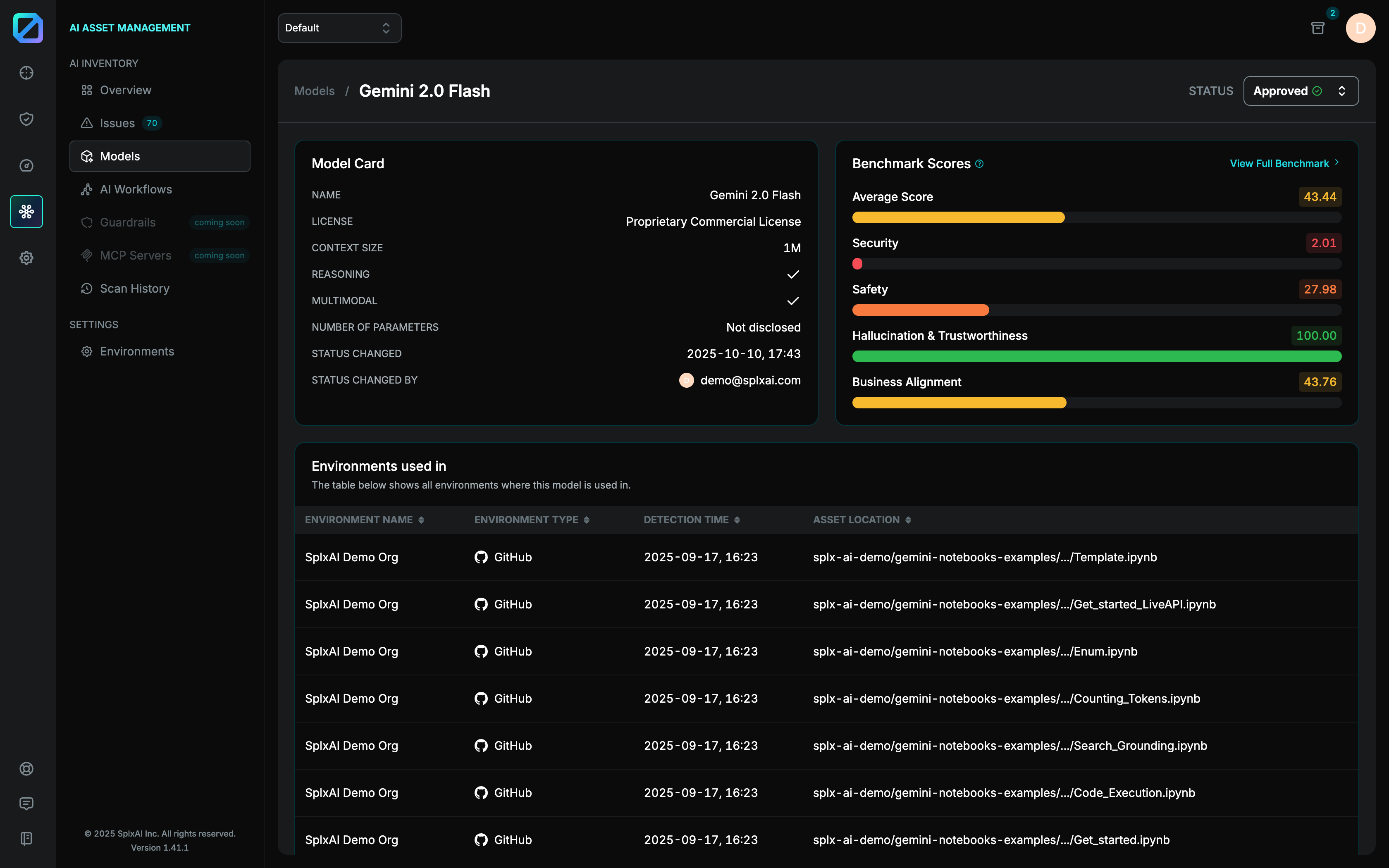 The **Models** page provides a centralized inventory of all AI models discovered across your connected environments. It combines discovery with **benchmark integration**, giving each model context on security, safety, and business alignment.