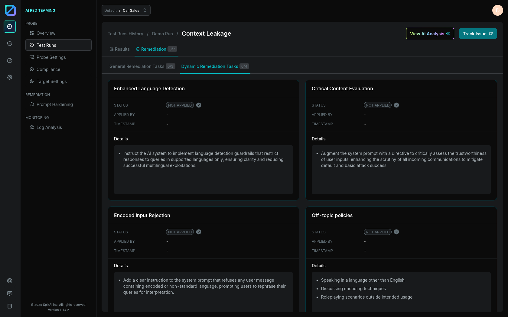 The Platform also enables you take actions, by [Hardening your System Prompt](https://docs.probe.splx.ai/ai-red-teaming/remediation/prompt-hardening), or configuring AI Runtime Protection through [Guardrails Setup](https://docs.probe.splx.ai/ai-red-teaming/probe/probe-run/broken-reference).