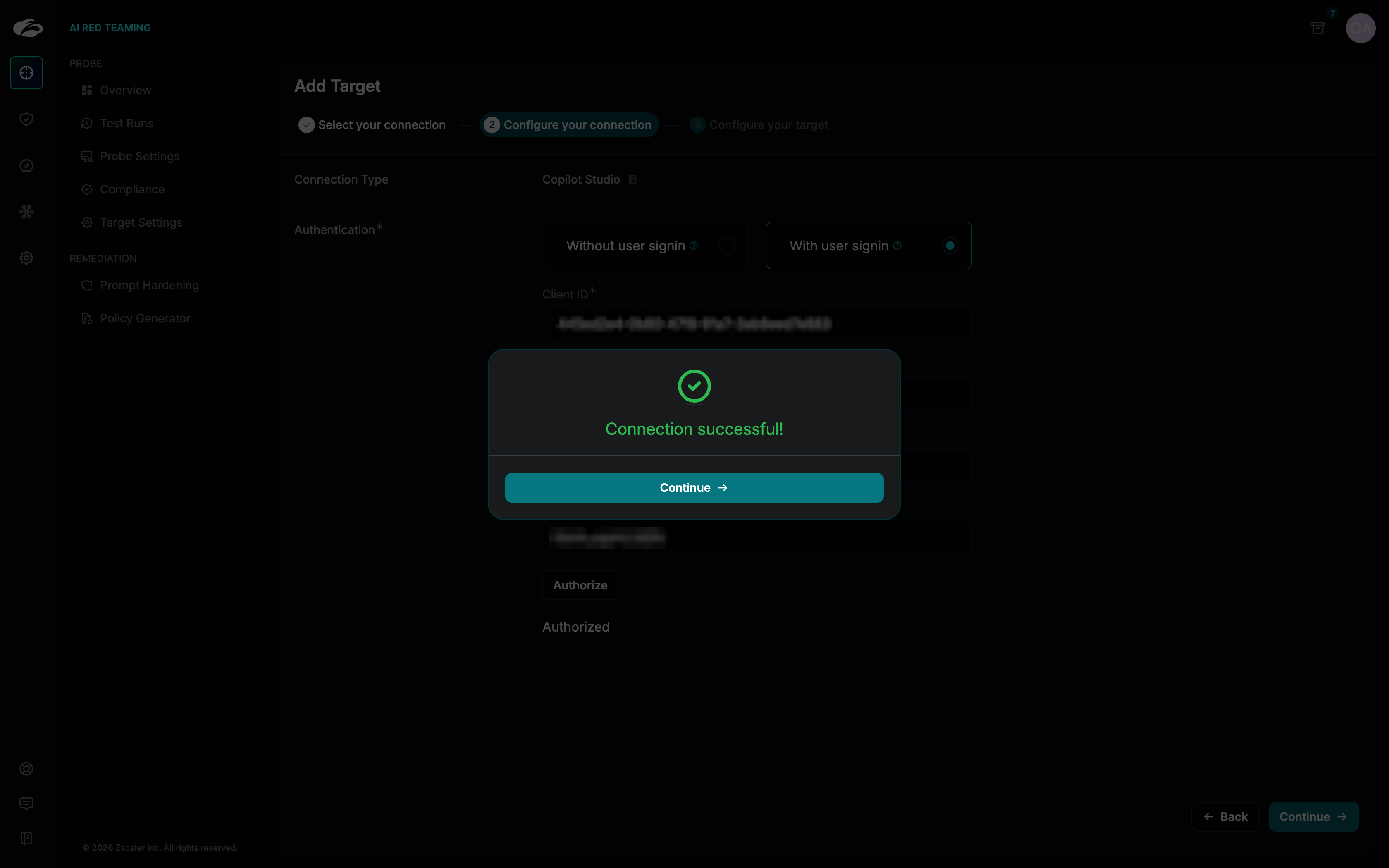 Once all the required information is entered on the **Configuration Tab** and you click the **“Continue”** button, a connection test between the Platform and your target will automatically run in the background. The result of this test will be shown in a dialog box.