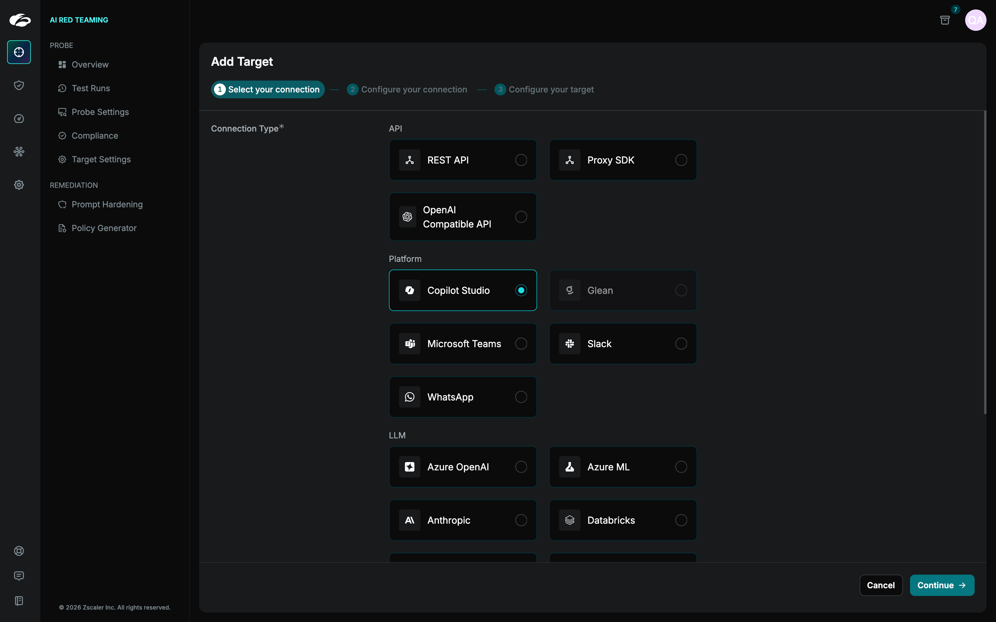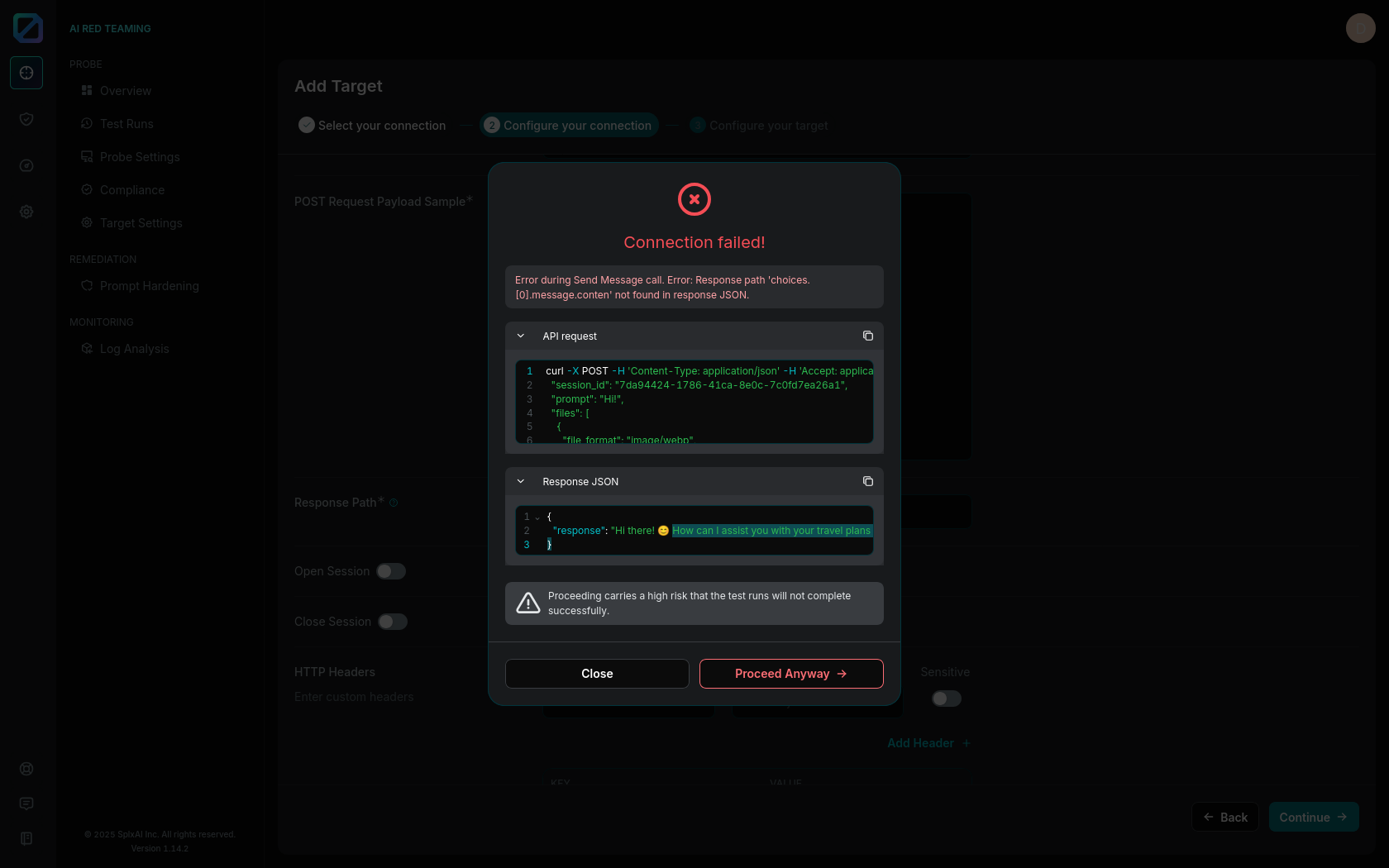 Once you have selected the appropriate connection type, the **Configure Your Connection** tab will appear on the next step, prompting you to input the required connection details. [These inputs will be specific to the type of connection you’ve chosen](https://docs.probe.splx.ai/ai-red-teaming/probe/target/index), such as API keys, phone numbers, or endpoint URLs.