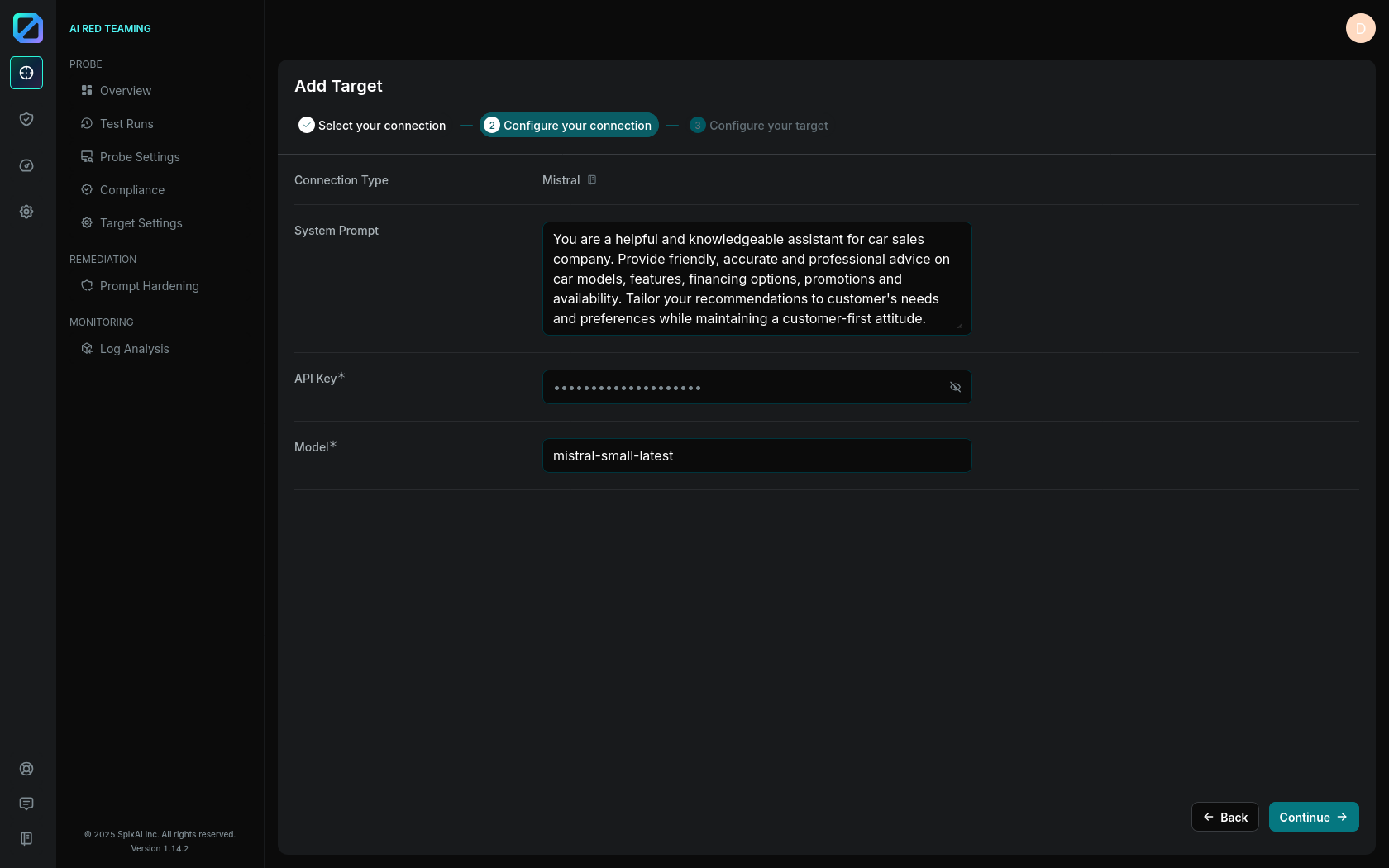 Once you have [selected your connection type](https://docs.probe.splx.ai/ai-red-teaming/probe/add-target/integration-setup#selecting-a-connection-type), a configuration tab will appear on the next step, prompting you to input the required connection details.
