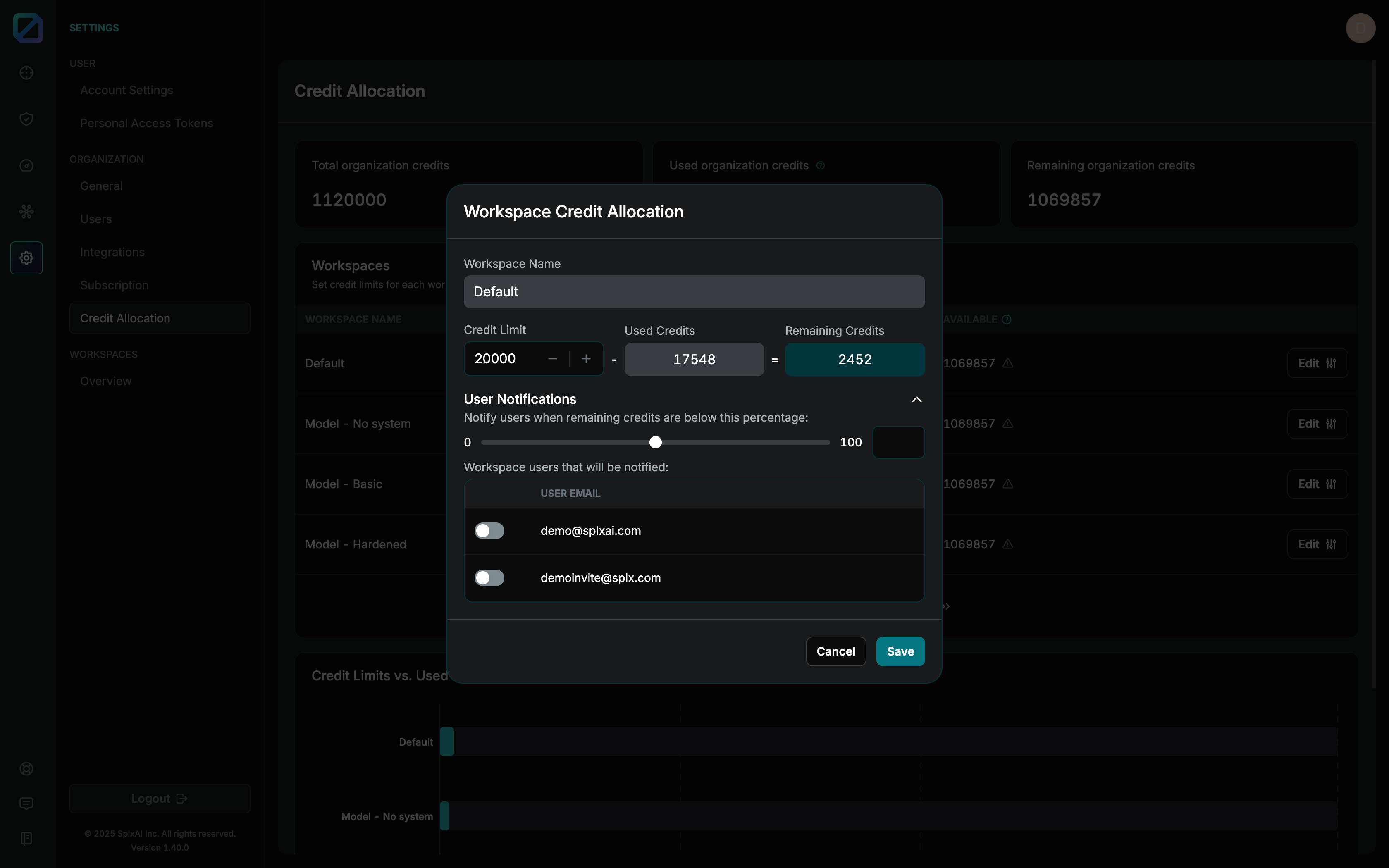 Navigate to the [**Organization Setting**](https://docs.probe.splx.ai/settings/platform-settings/organization-settings) and select the **Credit Allocation** from the navigation bar on the left side to start allocating your organization credits to workspaces.