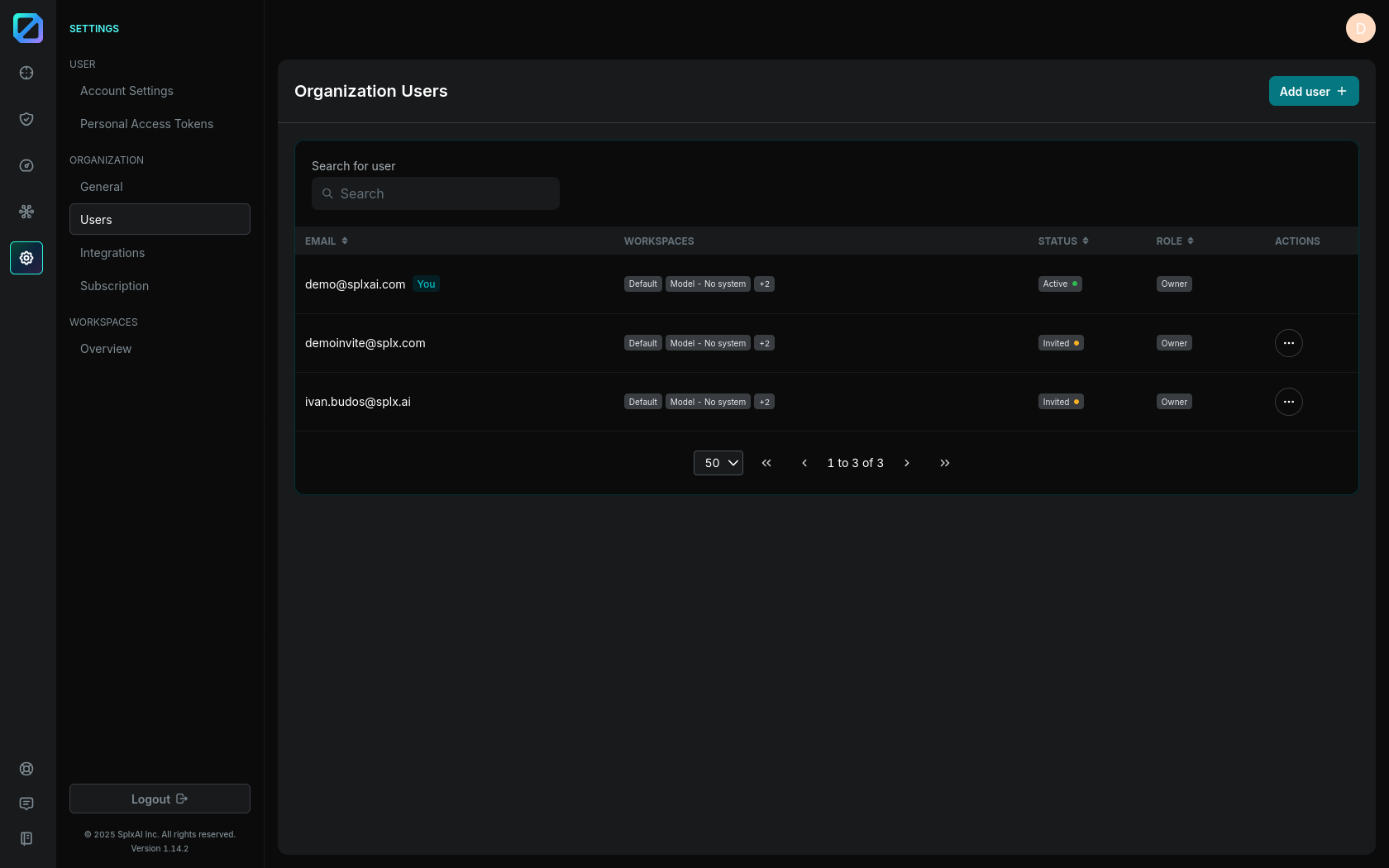 From here, you can [**invite new user to organization**](#inviting-users-to-your-organization) using the "Add user +" button, or [manage existing users/invitations](#managing-the-users) through the available actions.