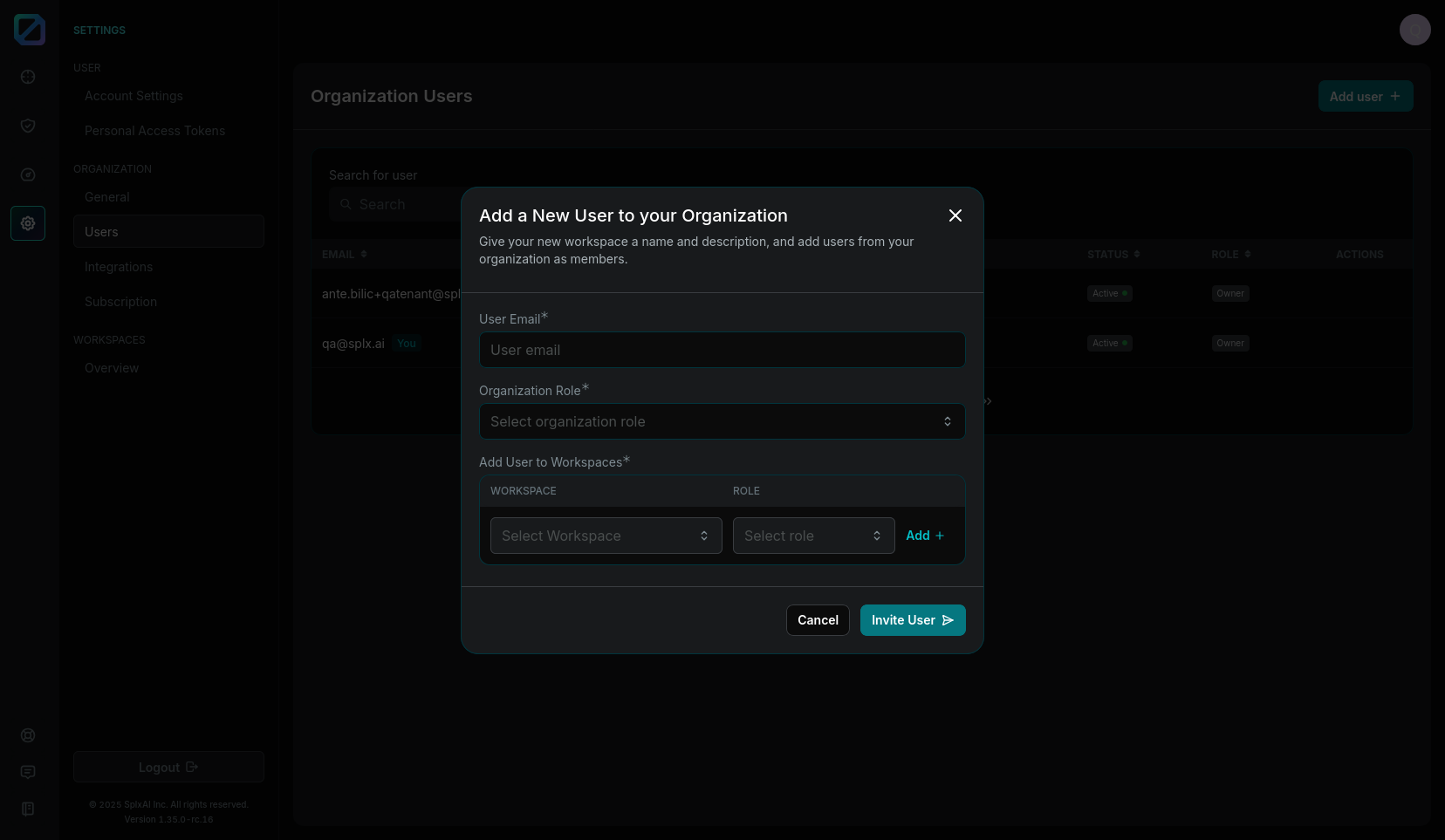 Navigate to the [**Organization Setting**](https://docs.probe.splx.ai/settings/platform-settings/organization-settings) and select the **User** from the navigation bar on the left side to start managing your organization users.
