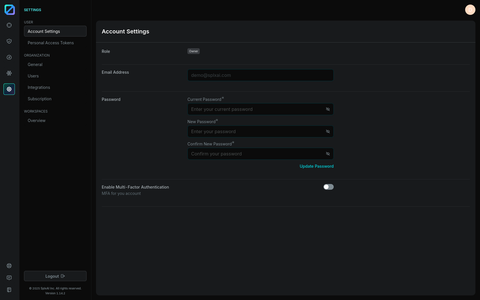 On the Account Settings page, you can view your organization level role and email address, update your password, and enable or disable Multi-Factor Authentication (MFA).